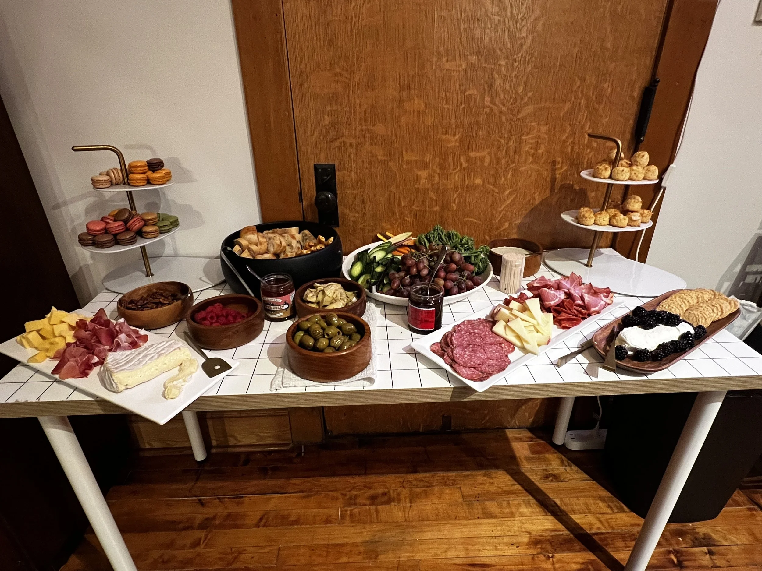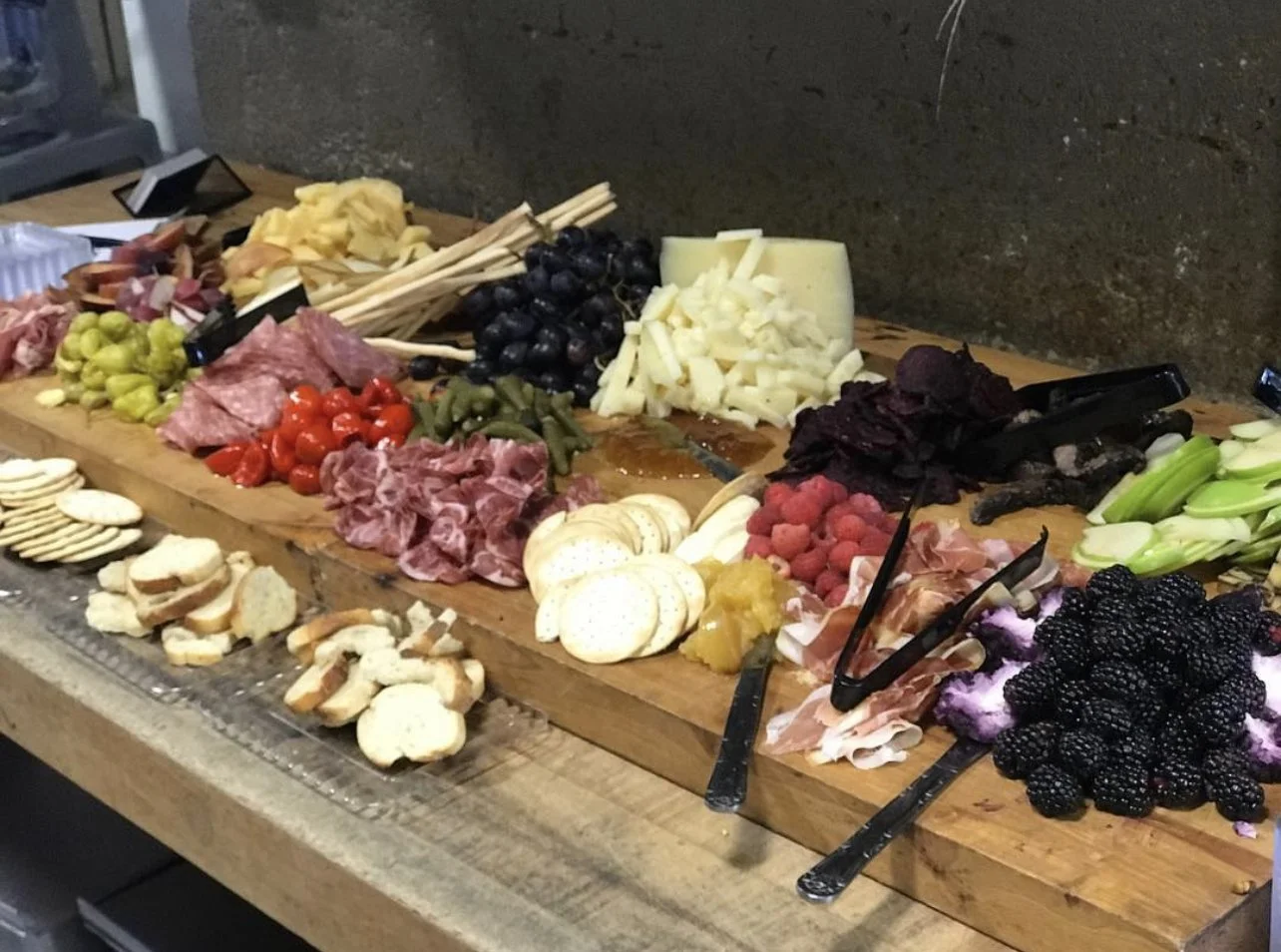 A buffet table with various cheeses, fruits, crackers, and meats, arranged for a gathering or event.
