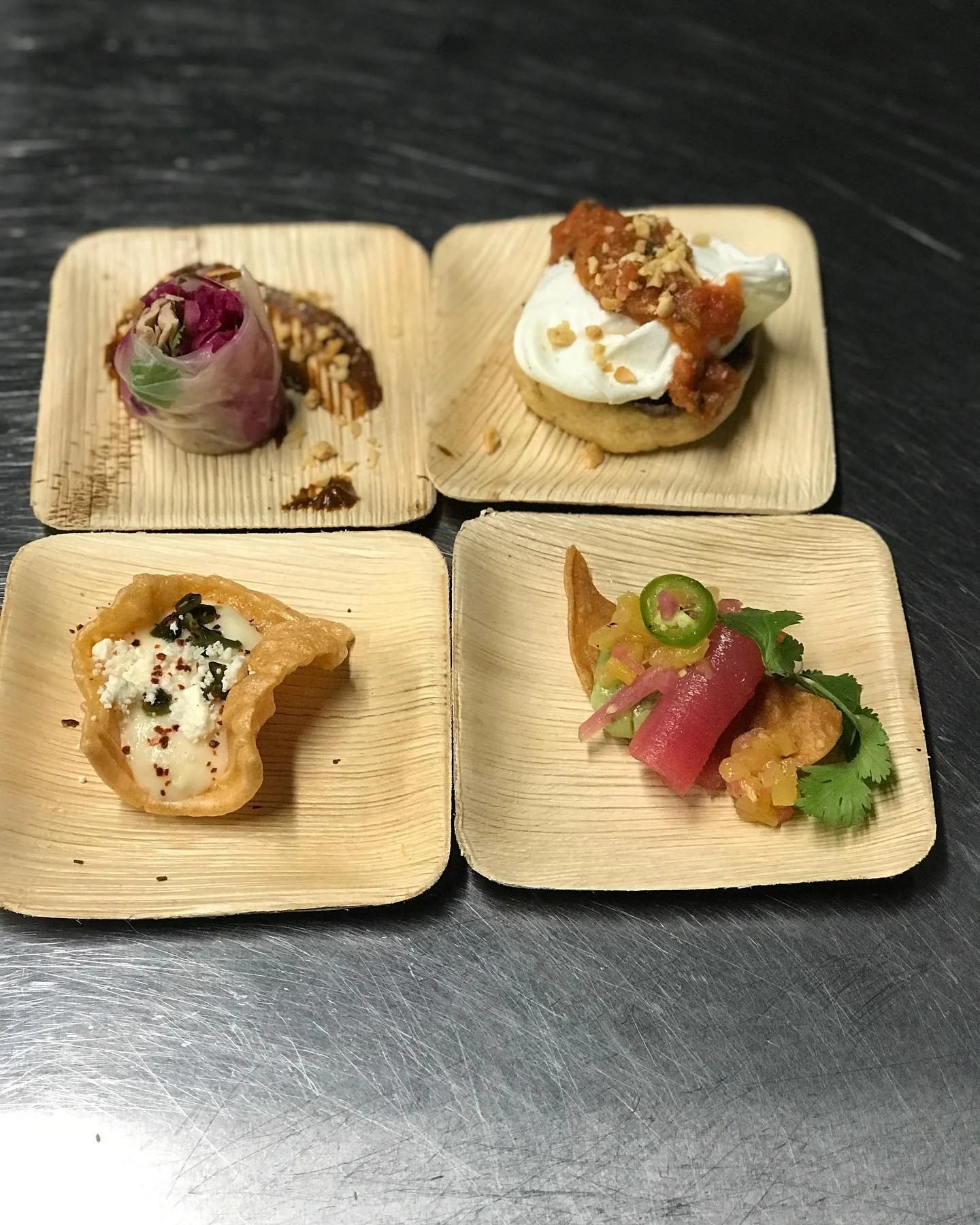 Four small dishes on wooden plates, including a wrapped spring roll, a small pastry with cheese and herbs, a taco with meat and toppings, and a small bowl with vegetables and cilantro.