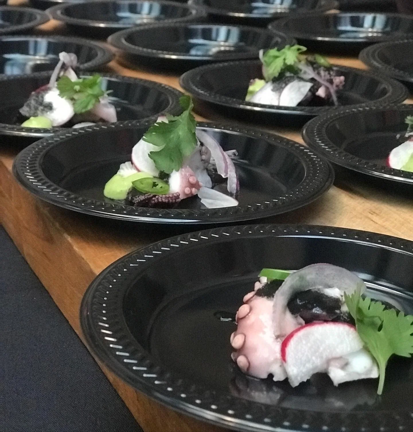 Plates with small octopus tentacles garnished with herbs, radish slices, and vegetables on a wooden table.