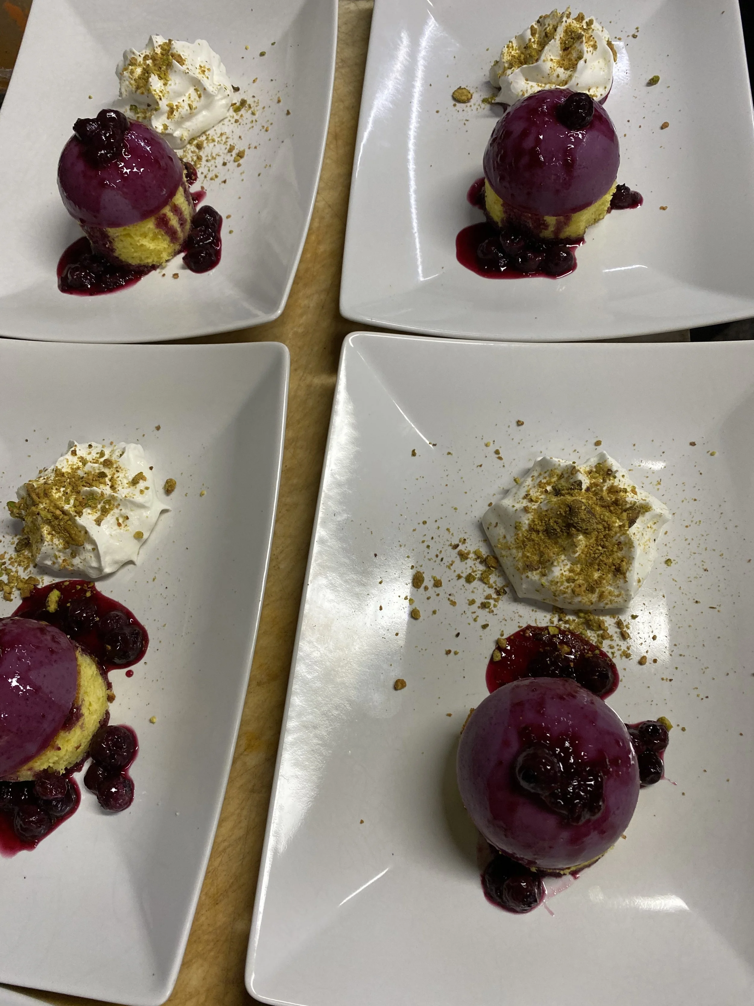 Four white rectangular plates each with a dessert consisting of a yellow sponge cake topped with purple glaze, blueberries, whipped cream with crushed cookies, served with a side of berry sauce and sprinkled with crushed cookies.