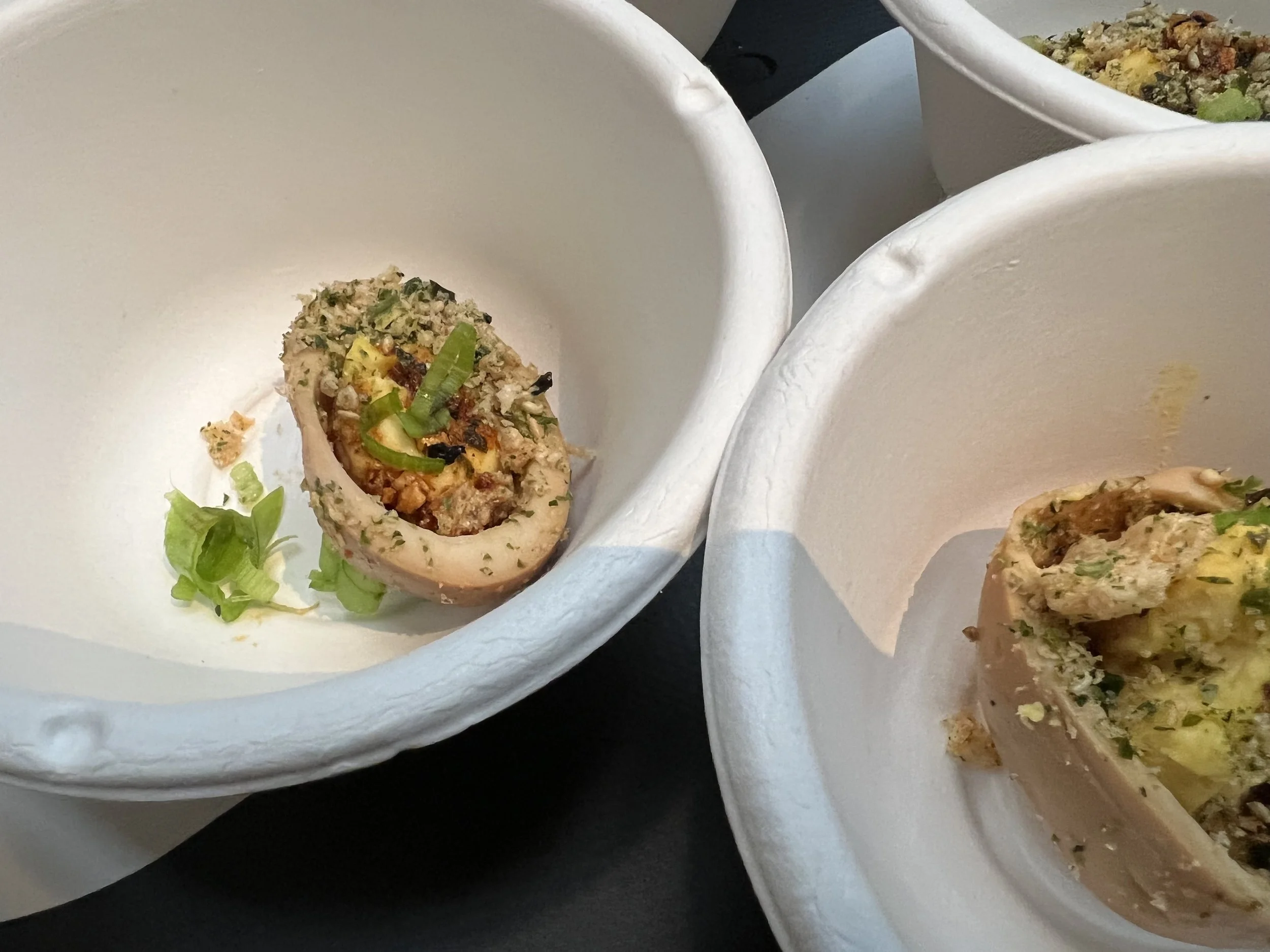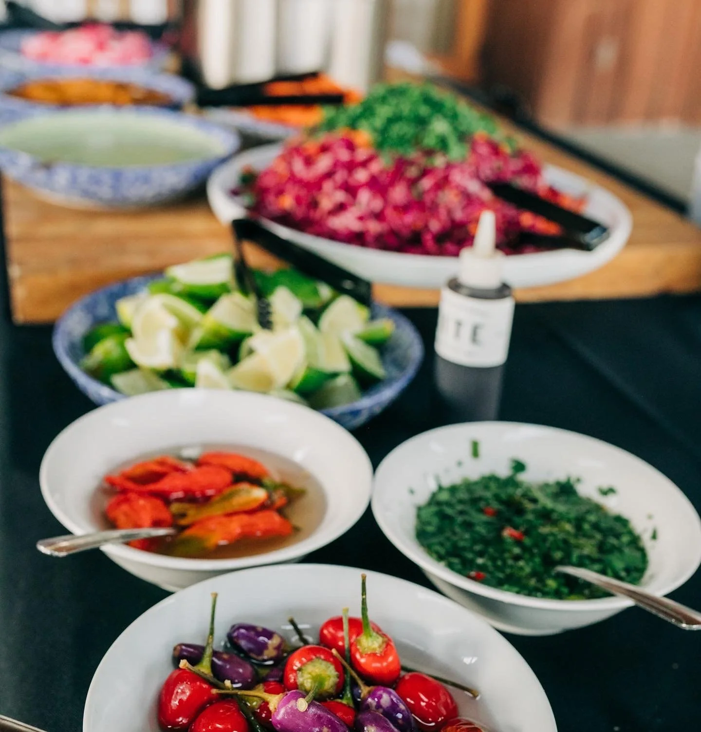 Several small white bowls on a table containing food with garnishes and seasonings, some bowls are empty or nearly empty, part of a black tablecloth with white text.