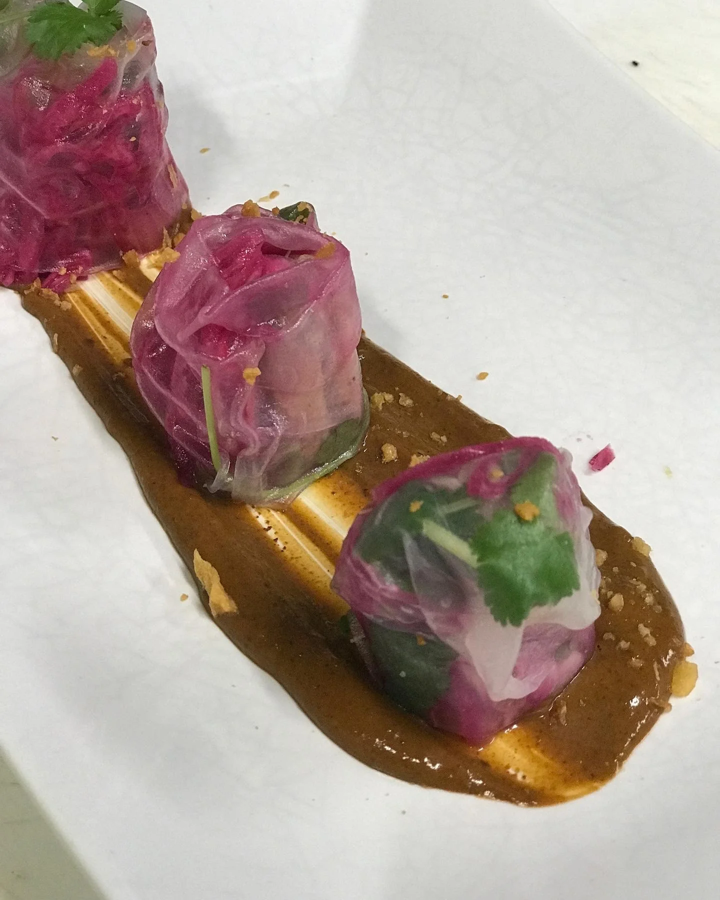 Three colorful spring rolls with pink and green vegetables, served on a white plate with a brown sauce.