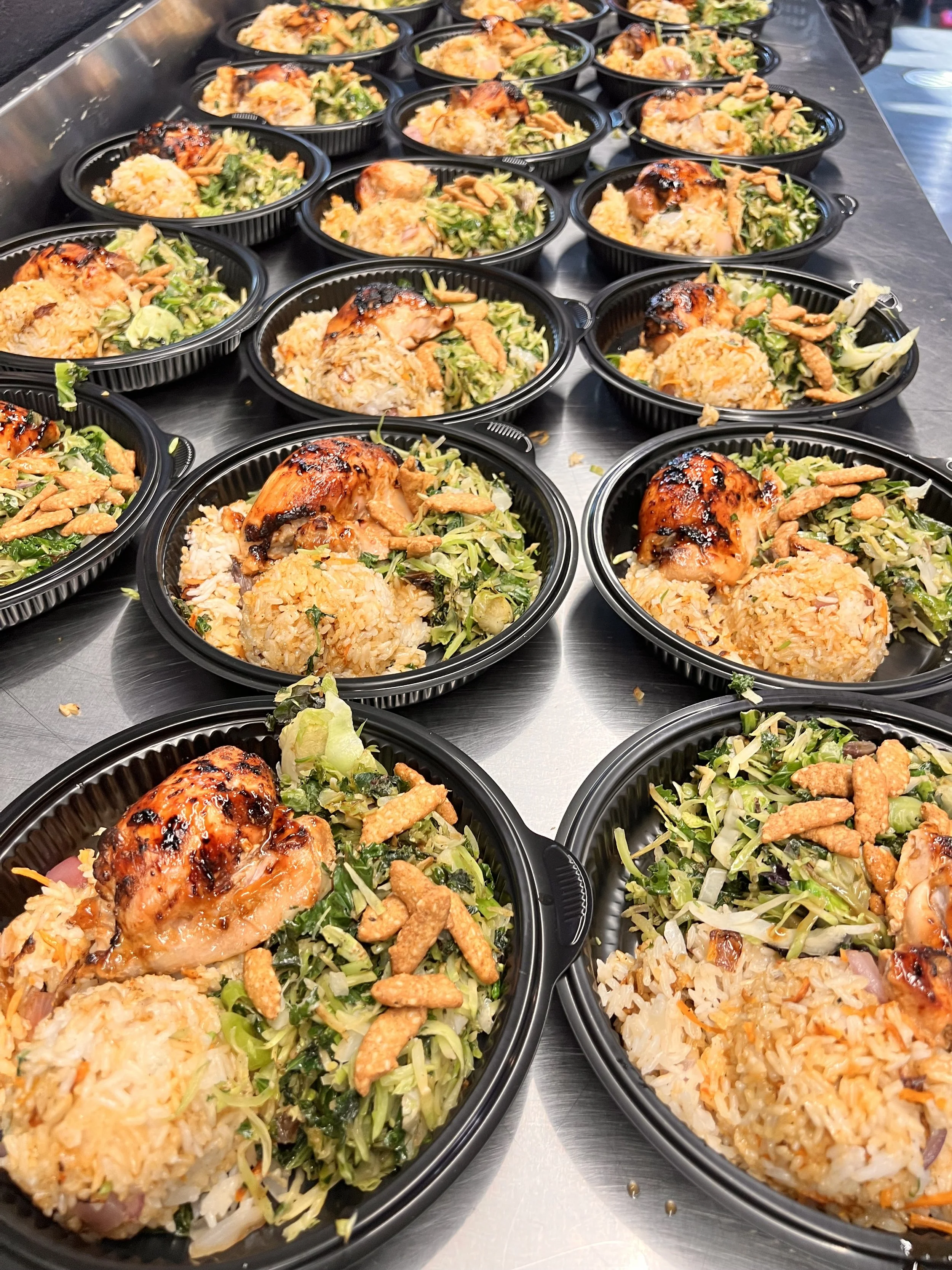 Multiple black plastic containers filled with rice, grilled chicken, and mixed salad with crispy toppings, arranged on a metal surface.