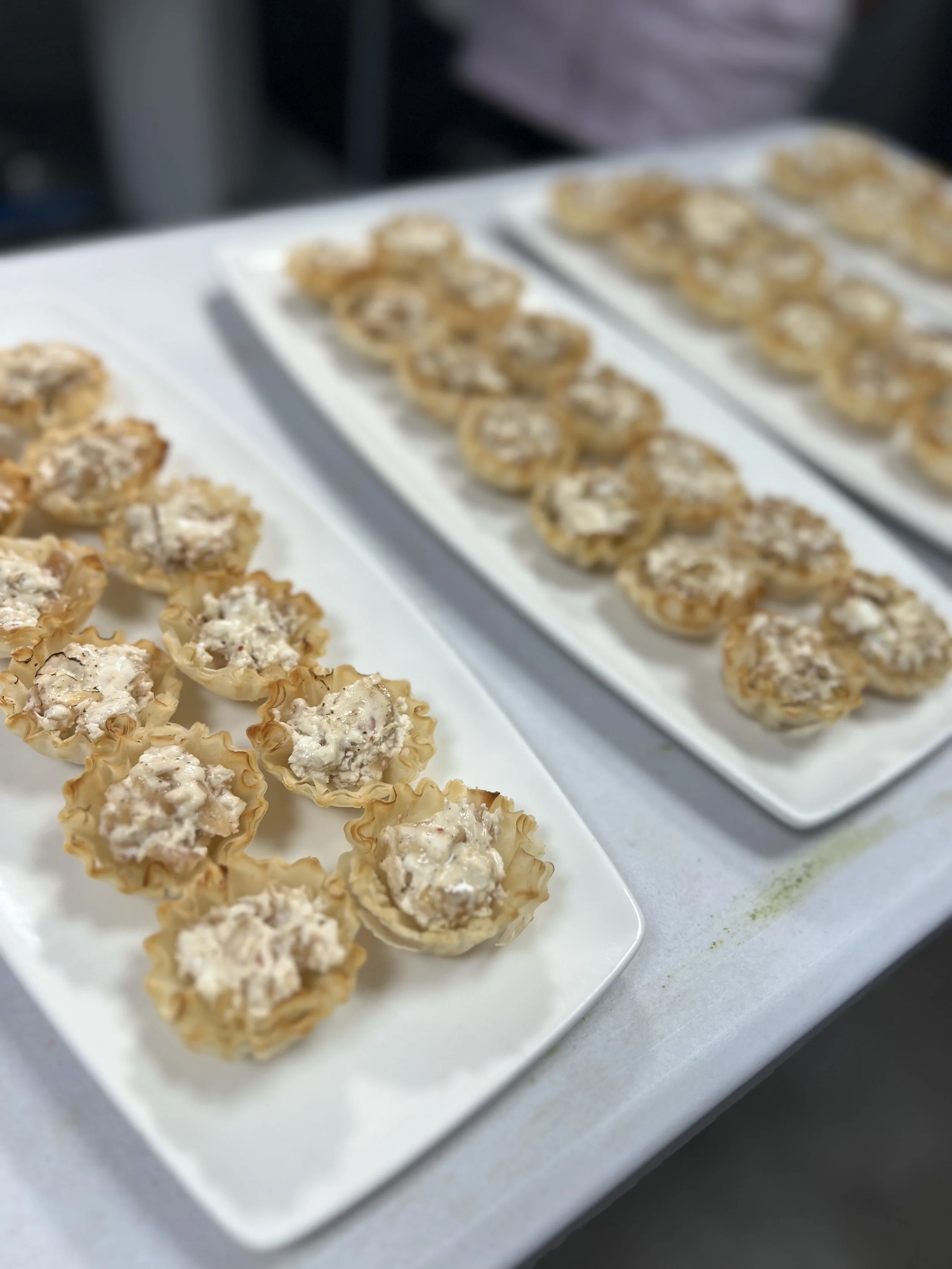 Three white rectangular plates with mini tartlets filled with creamy mixture, arranged on a table.