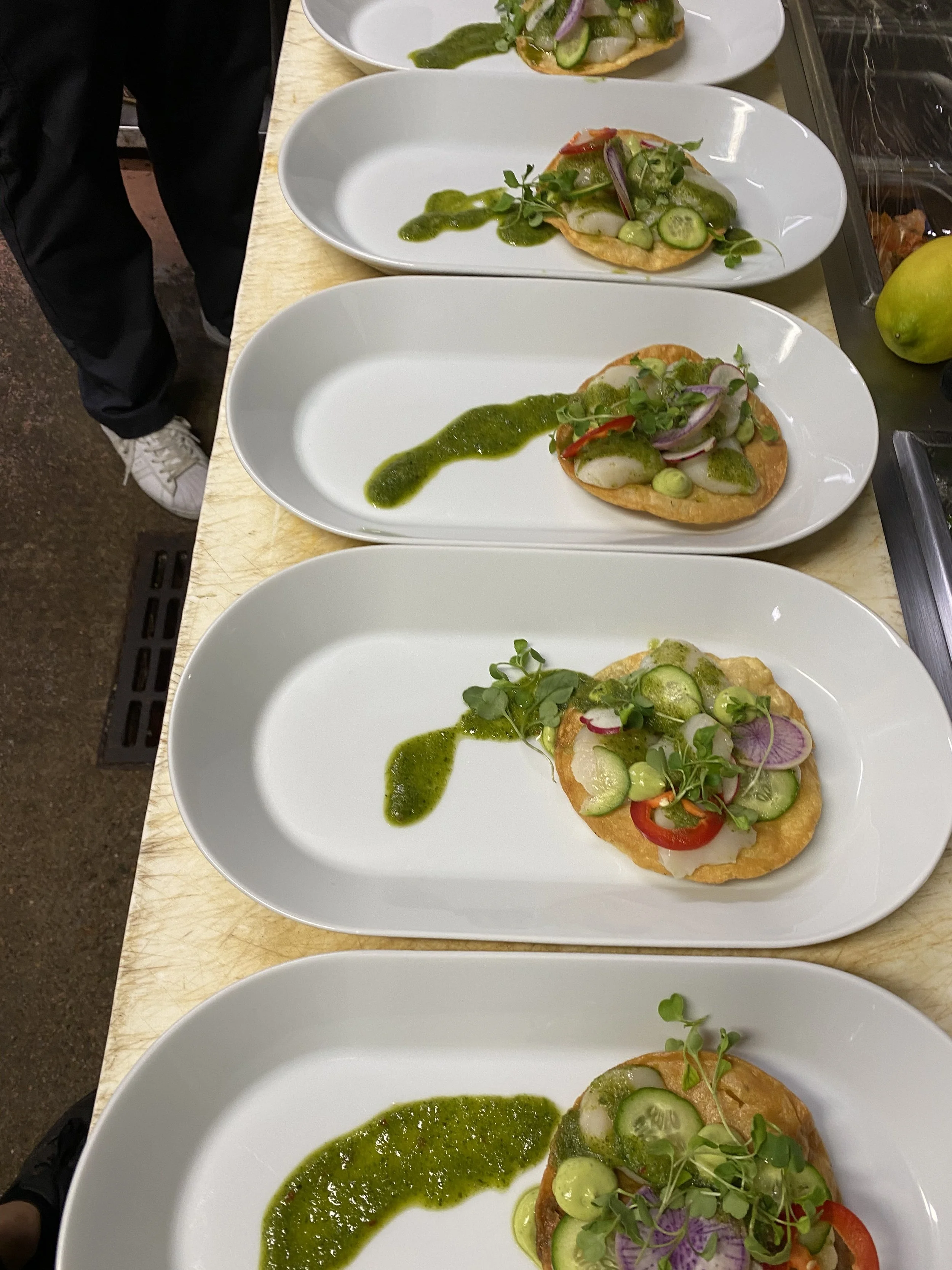 Five plates of gourmet appetizers with fried dough bases topped with sliced cucumbers, radish, red pepper, microgreens, and drizzled with green sauce, arranged on a countertop.