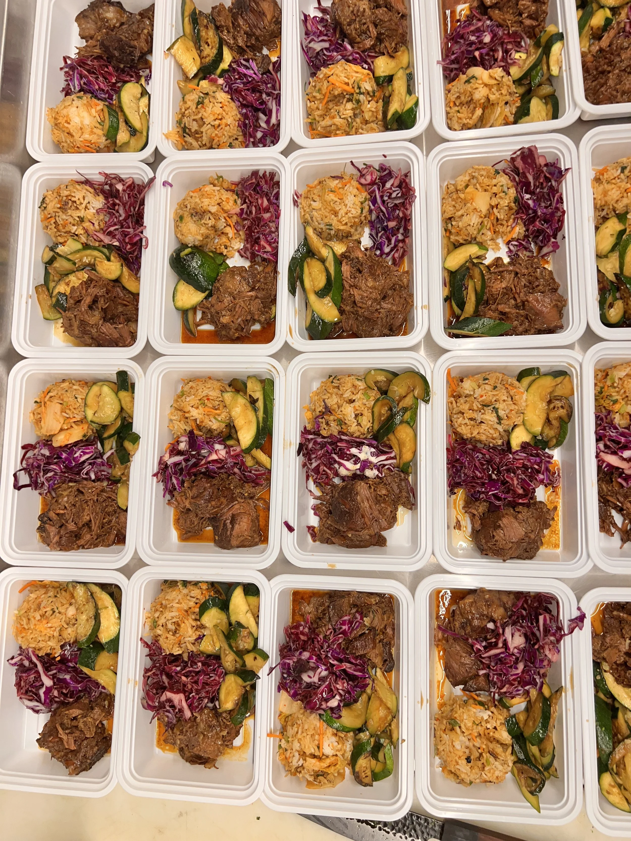 Multiple meal prep containers filled with rice, shredded red cabbage, cooked zucchini, and chunks of beef.