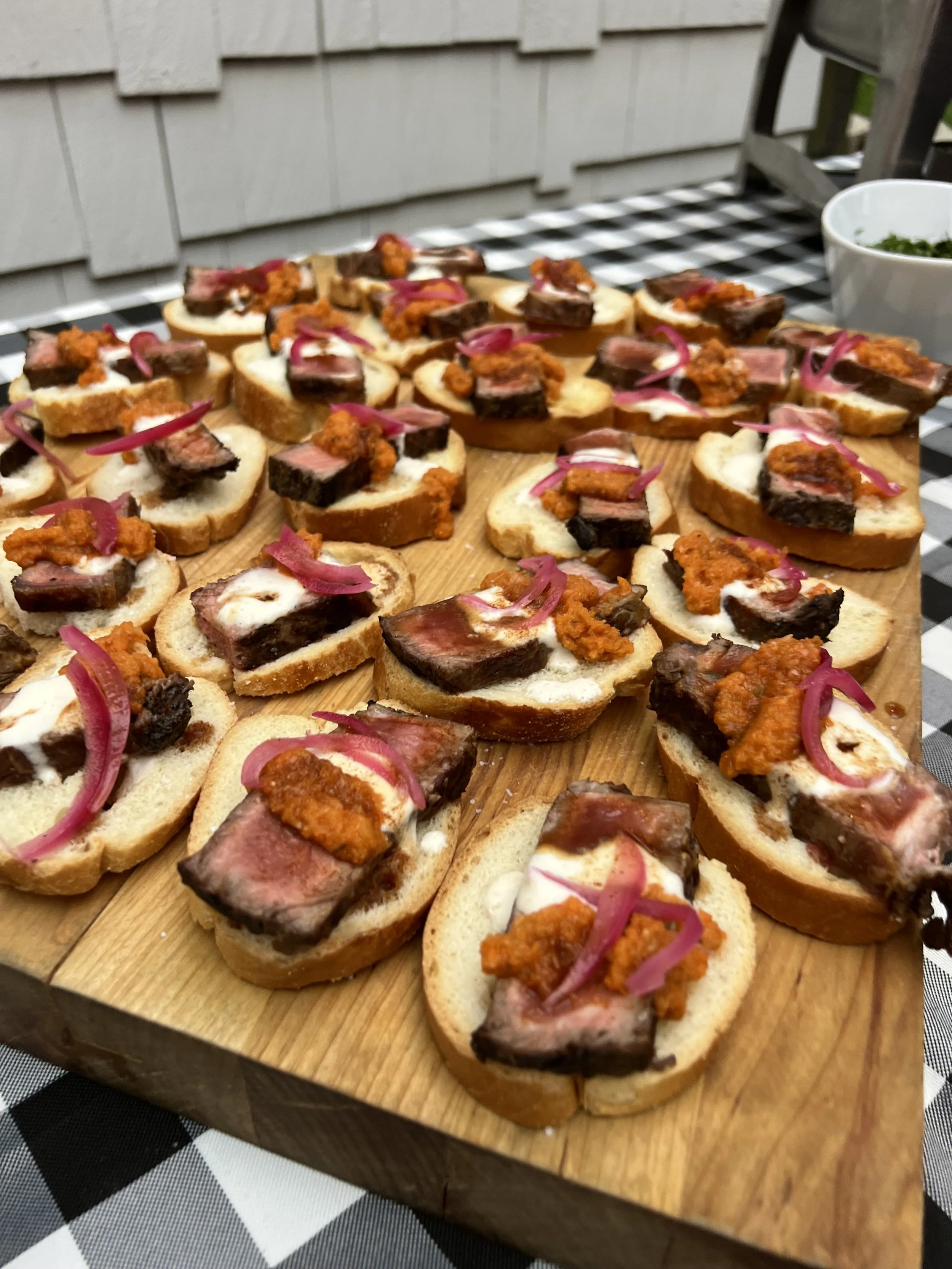 Assorted beef sliders topped with red onions and orange sauce on a wooden serving board, set on a black and white checkered tablecloth.