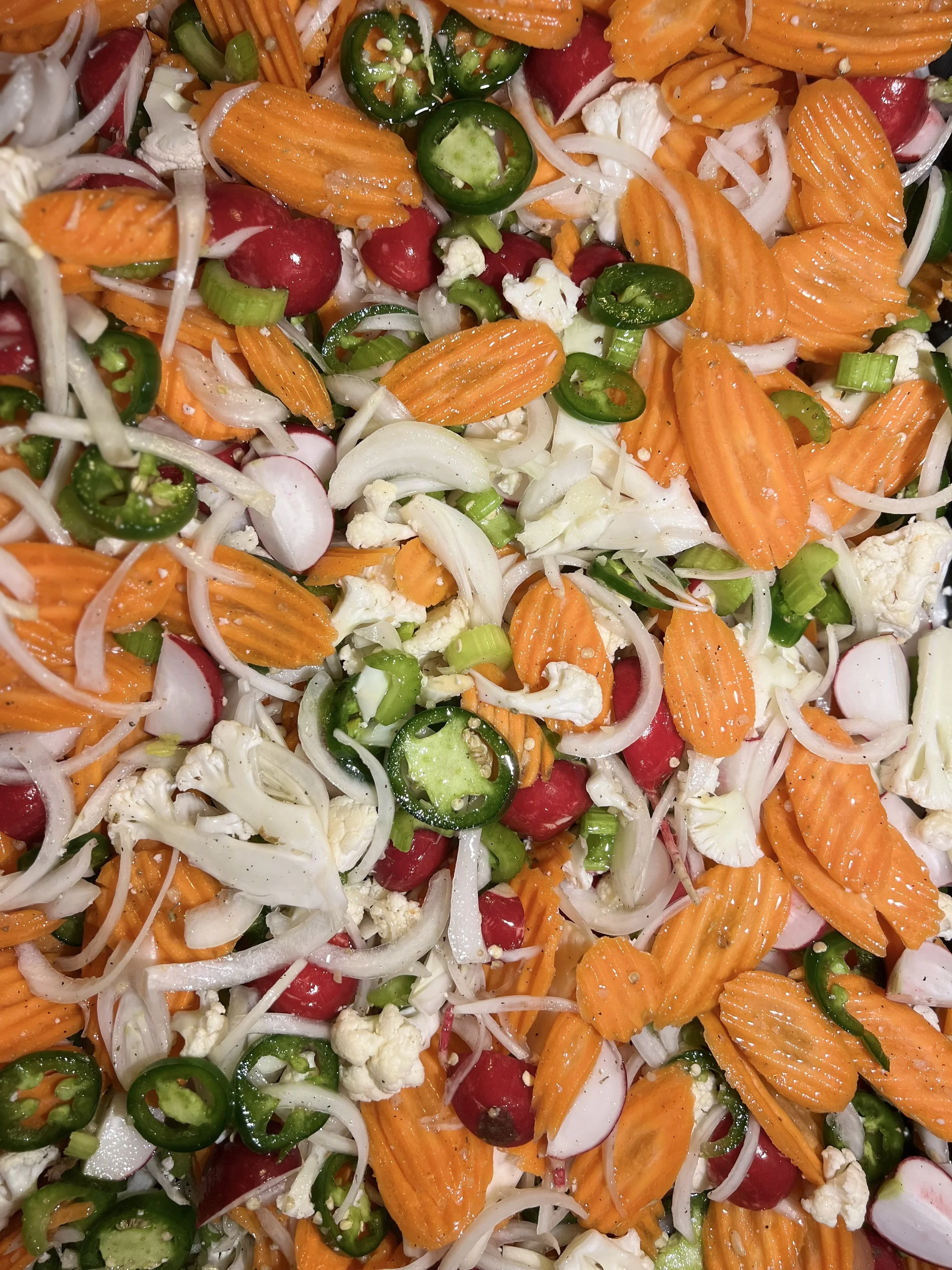 Close-up of a colorful pickled vegetable with shredded carrots, radishes, sliced jalapeños, thinly sliced onions, cauliflower, and celery.