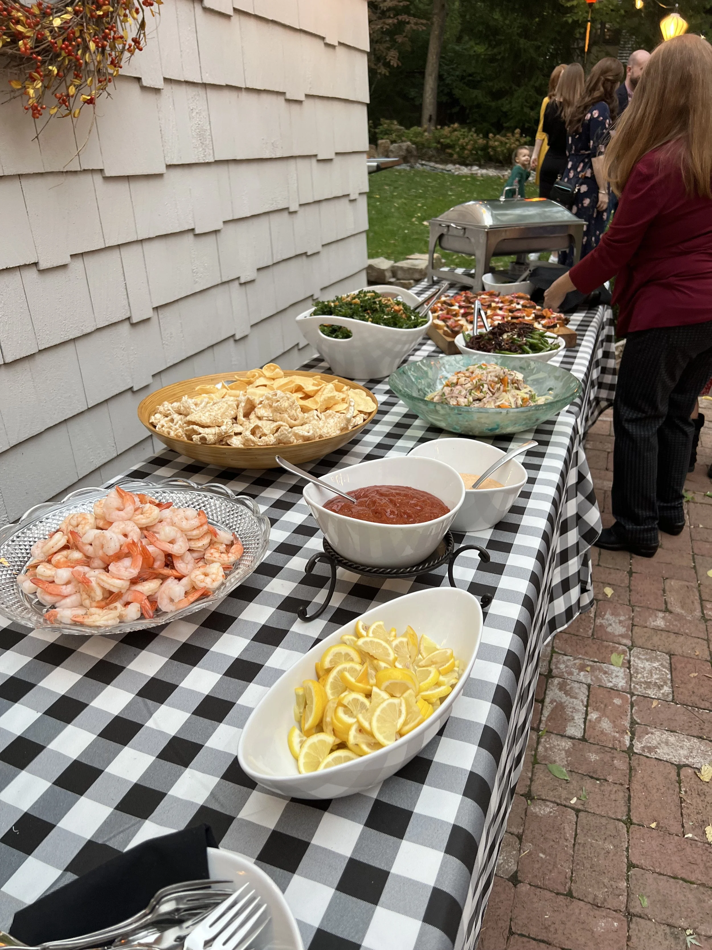 Outdoor buffet table with shrimp, lemon slices, salad, pasta, shrimp cocktail, chips, and various dishes, set against a white house wall with guests in the background during an evening gathering.