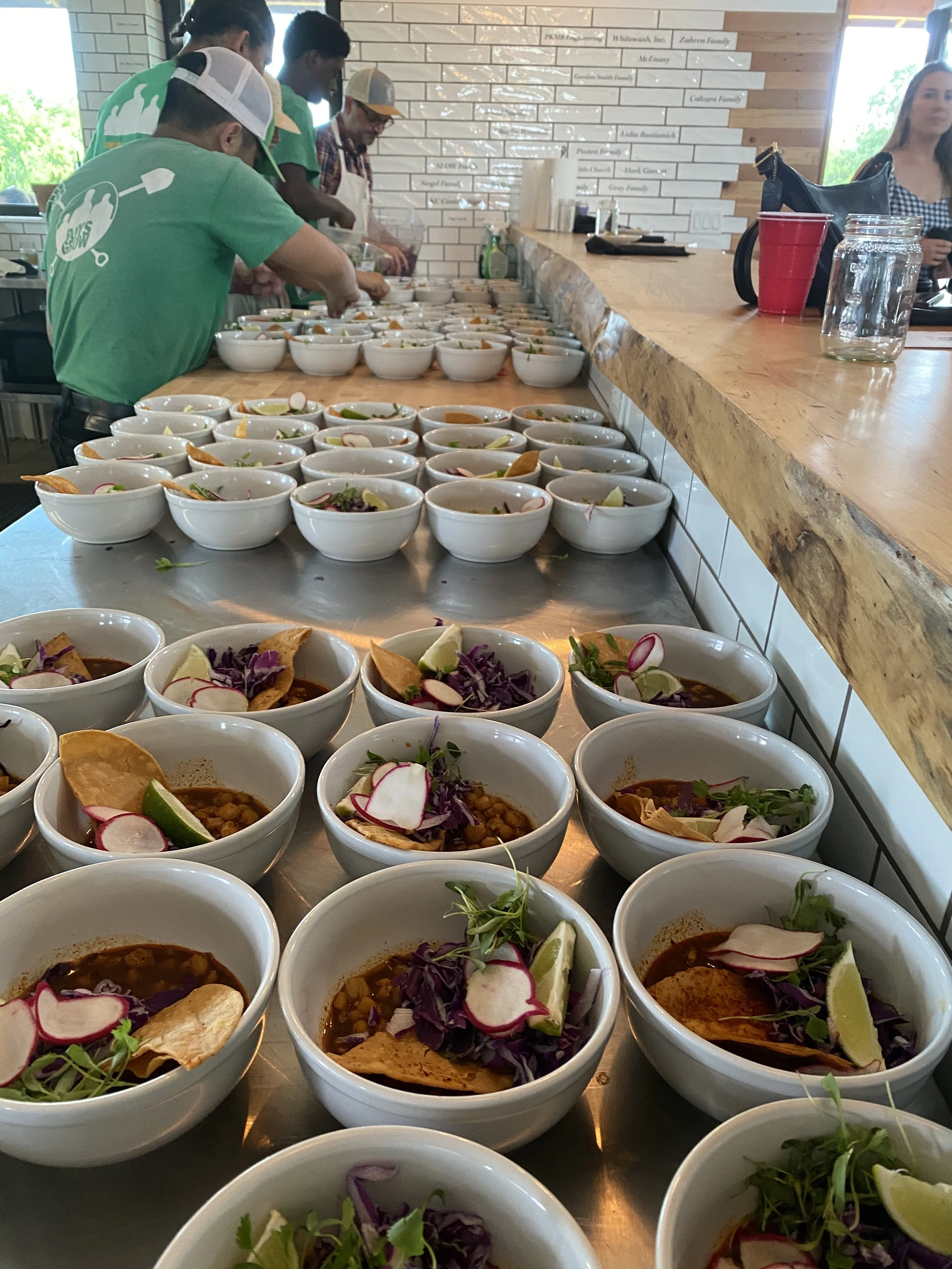 Multiple bowls of soup topped with radish slices, lime wedges, shredded cabbage, and crispy chips, set on a stainless steel surface in a busy open kitchen or restaurant.