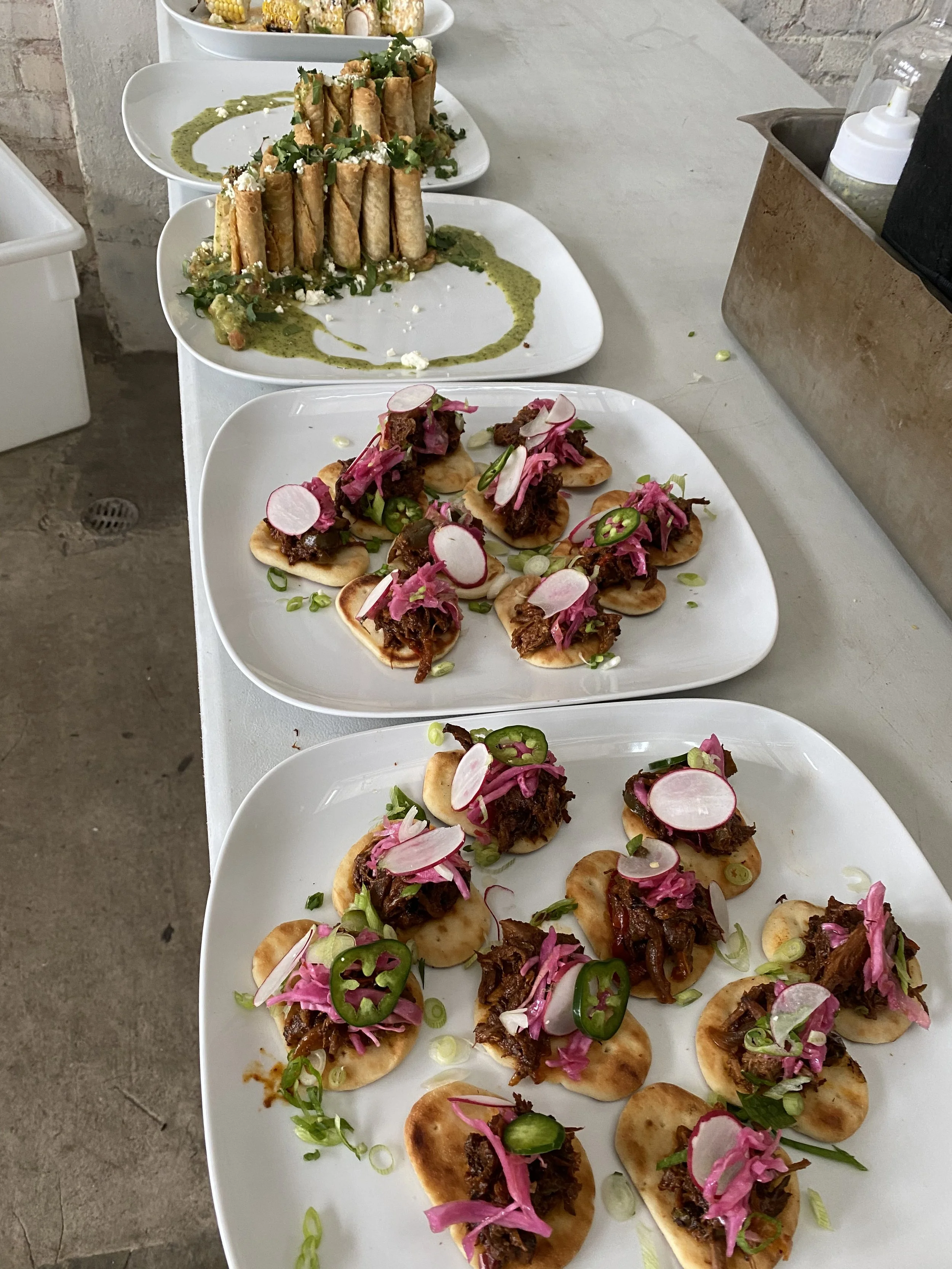 Three white plates with small tacos topped with shredded meat, pickled onions, and sliced radishes. The plates are arranged in a staggered line on a white table top.