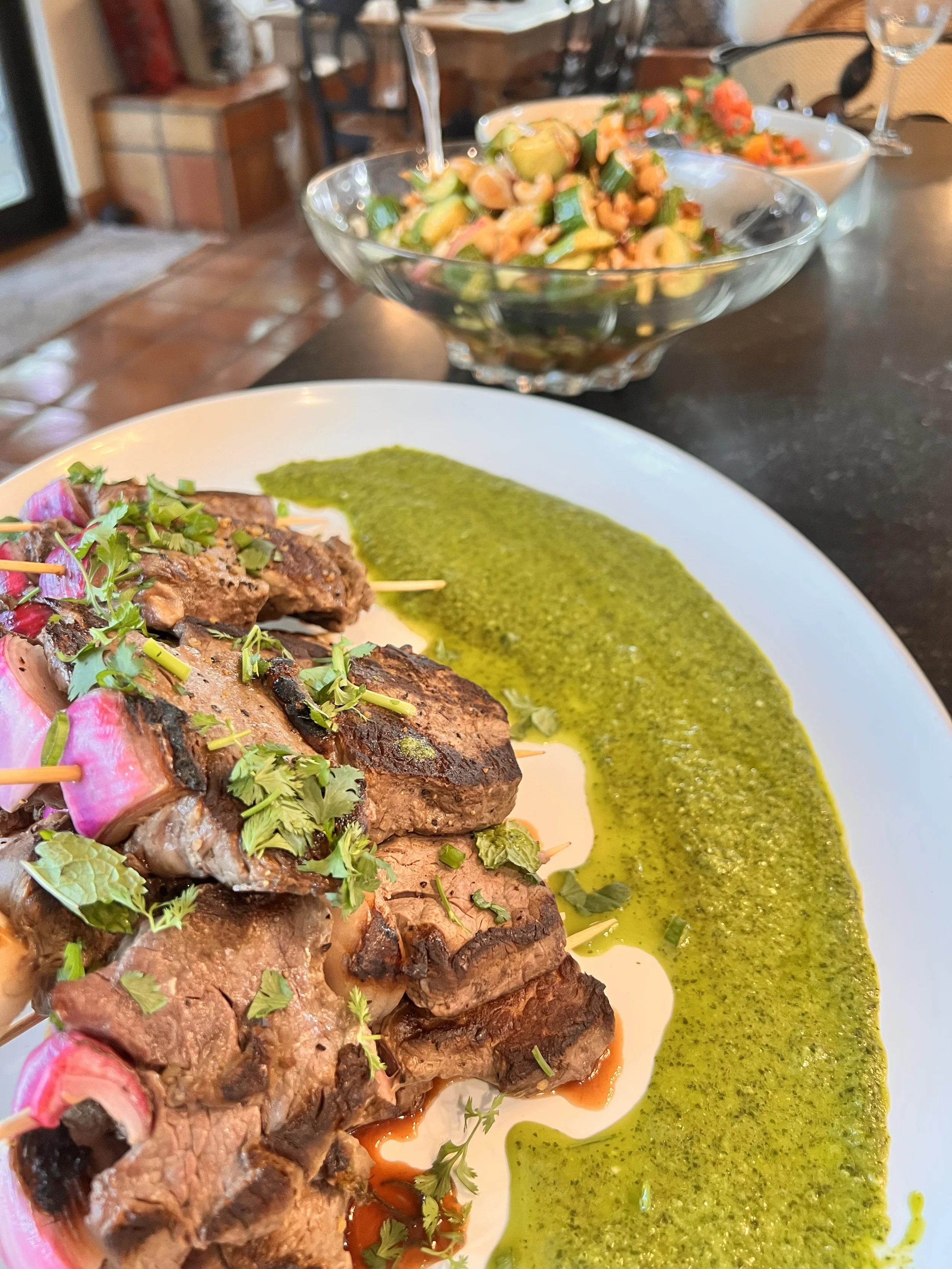 Close-up of grilled meat skewers garnished with herbs on a white plate, with a green sauce on the side, and salads in glass bowls in the background on a dark table.