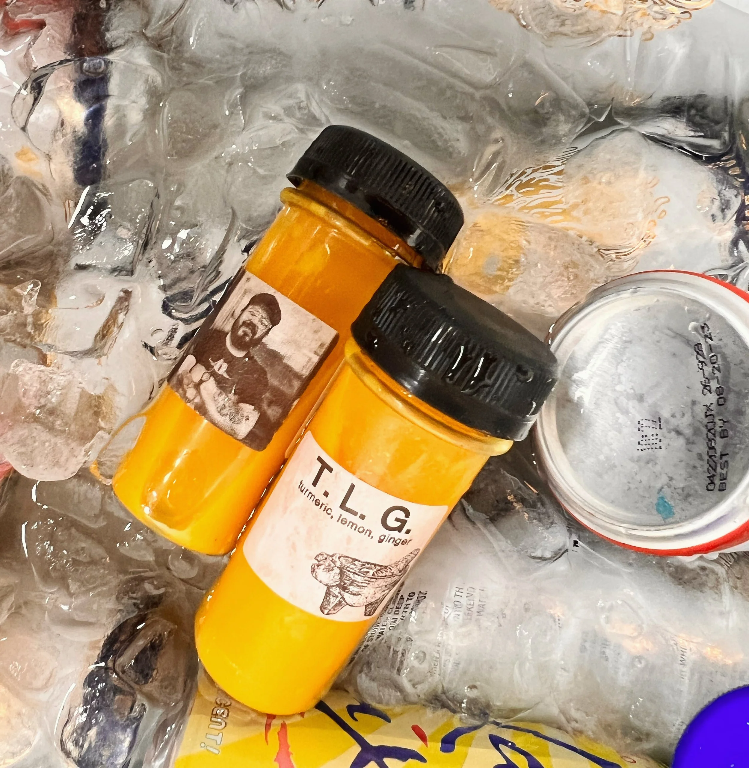 Two small bottles of T.L.G. turmeric, lemon, and ginger supplement with black caps surrounded by ice in a bag.