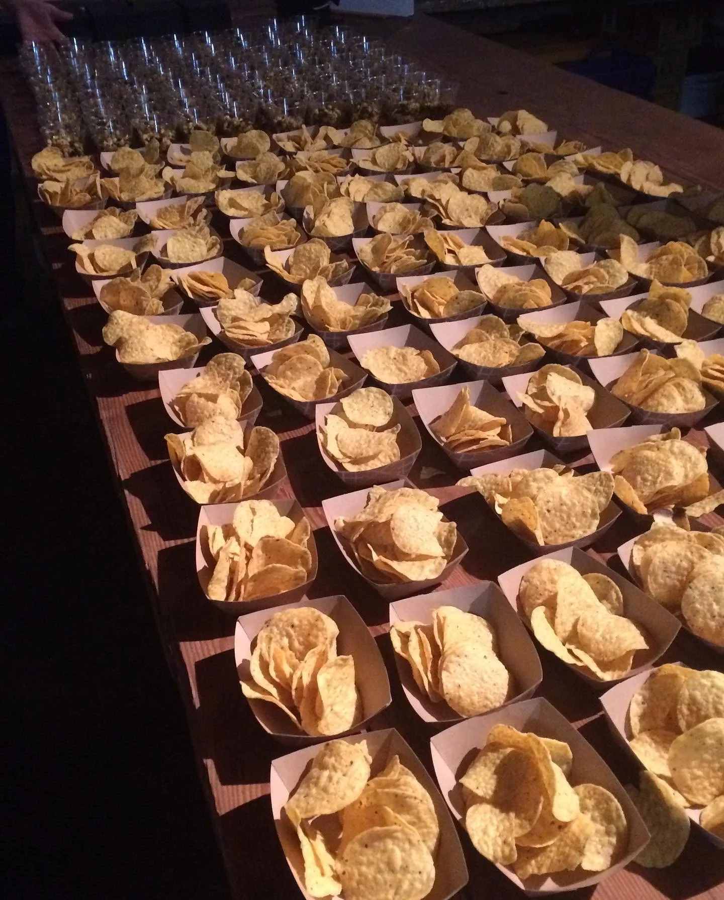 Rows of potato chips served in small paper bowls on a wooden table, with shot glasses in the background.