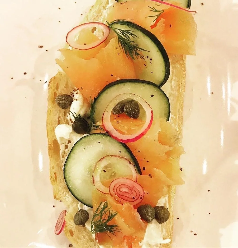 A vegetarian dish with sliced cucumbers, radishes, smoked salmon, capers, and fresh dill on a toasted bread base, garnished with black pepper.