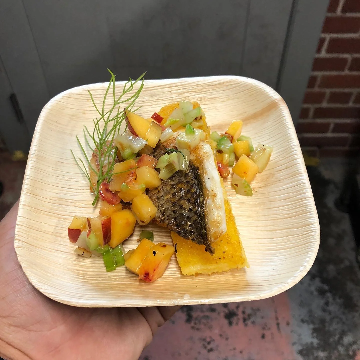 A plate with a fried fish fillet topped with a mango salsa and garnished with a sprig of herbs.