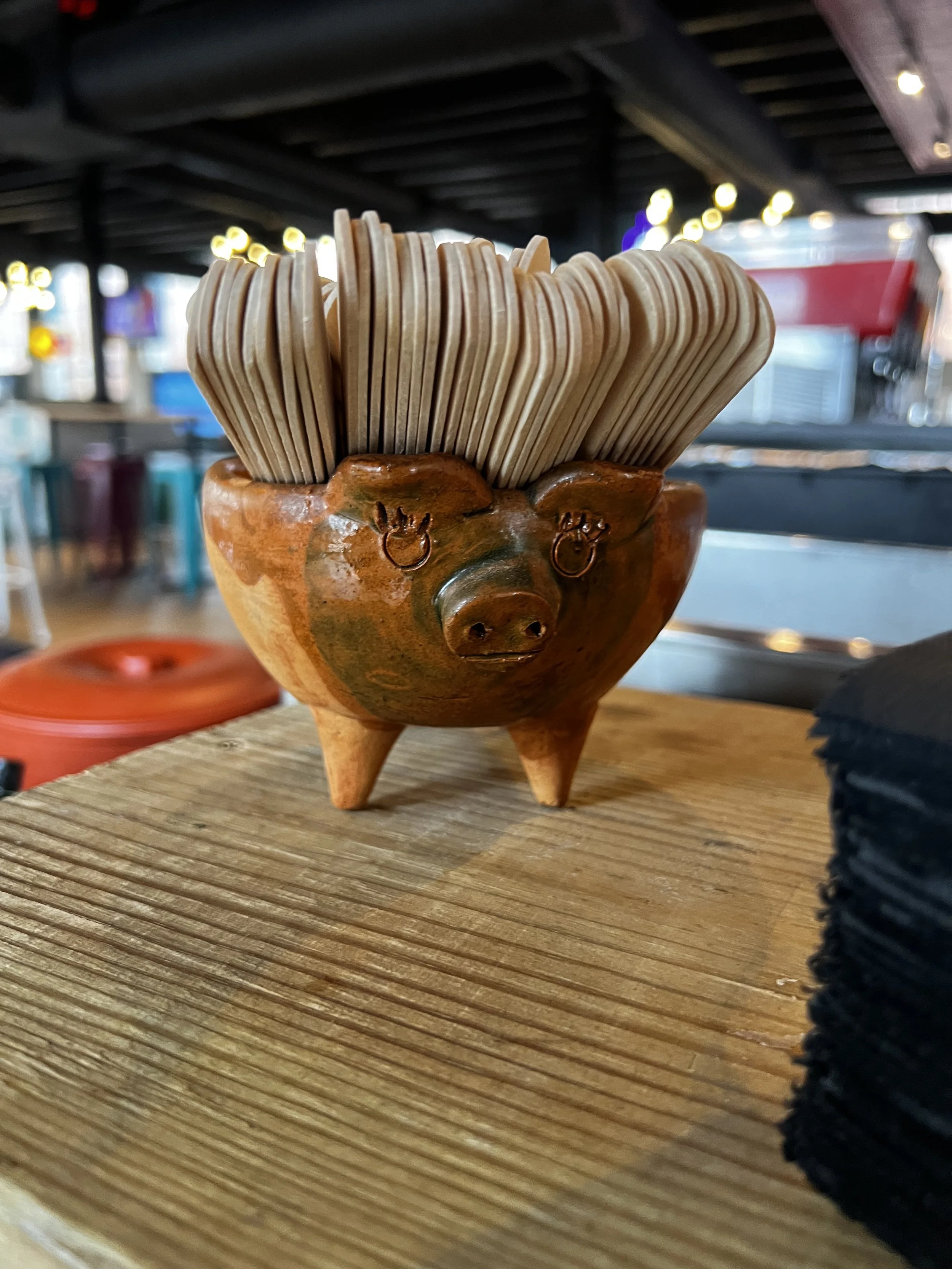 A ceramic pig-shaped container holding numerous wooden disposable chopsticks, placed on a wooden surface in a restaurant or cafe setting.