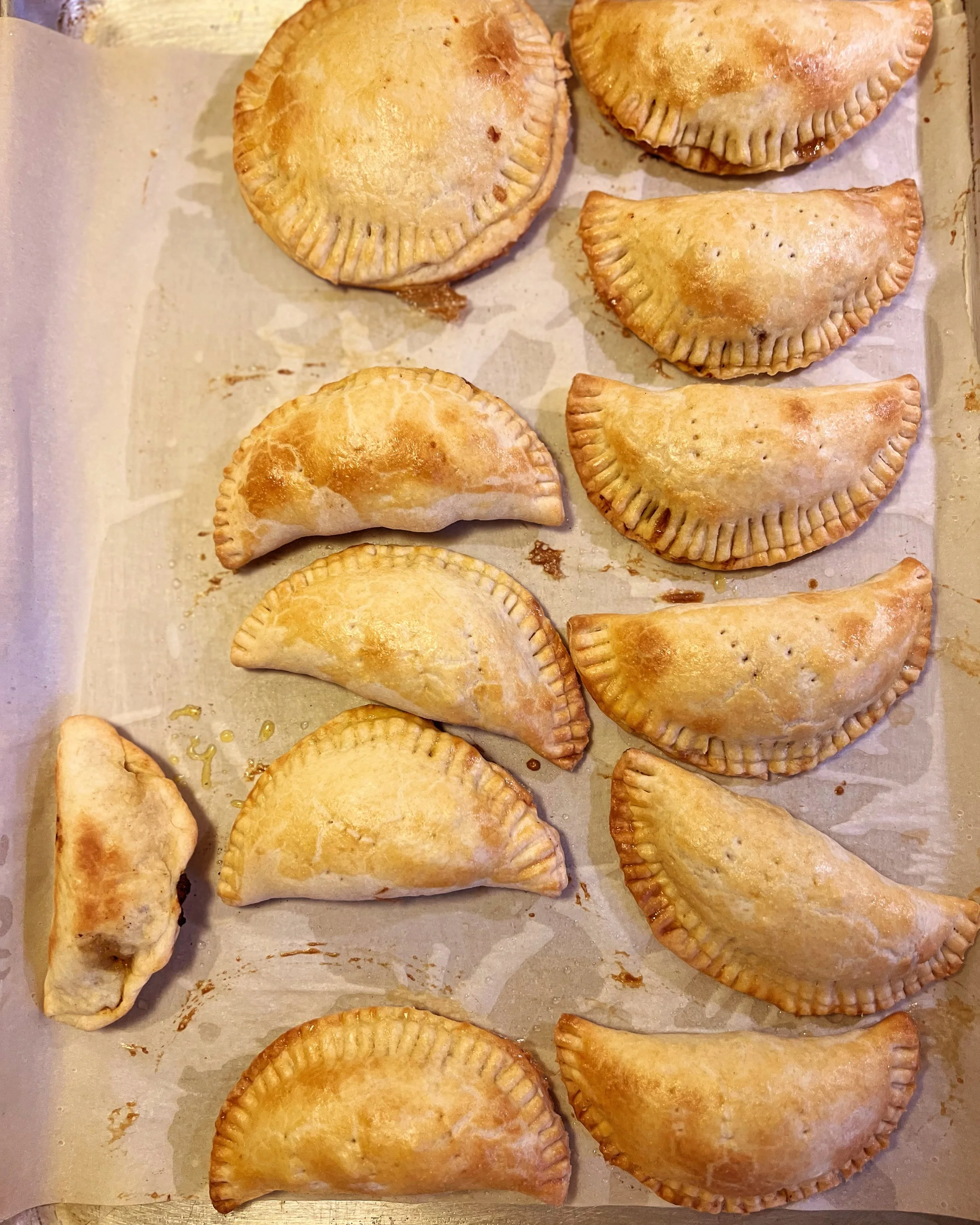 Baked empanadas arranged on a baking sheet.
