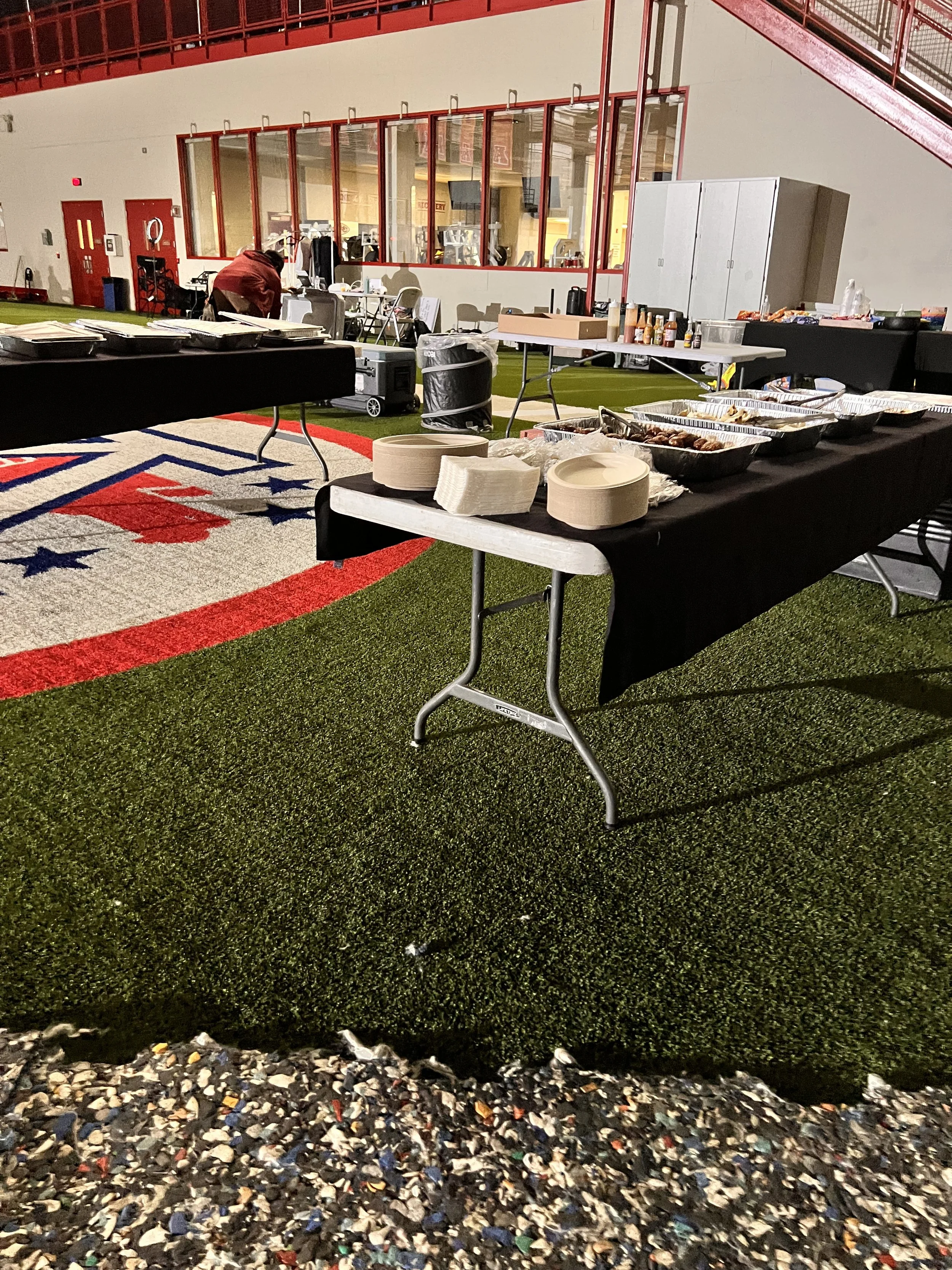 A banquet or buffet setup on artificial grass, with trays of food, plates, and condiments, inside a sports stadium or arena.