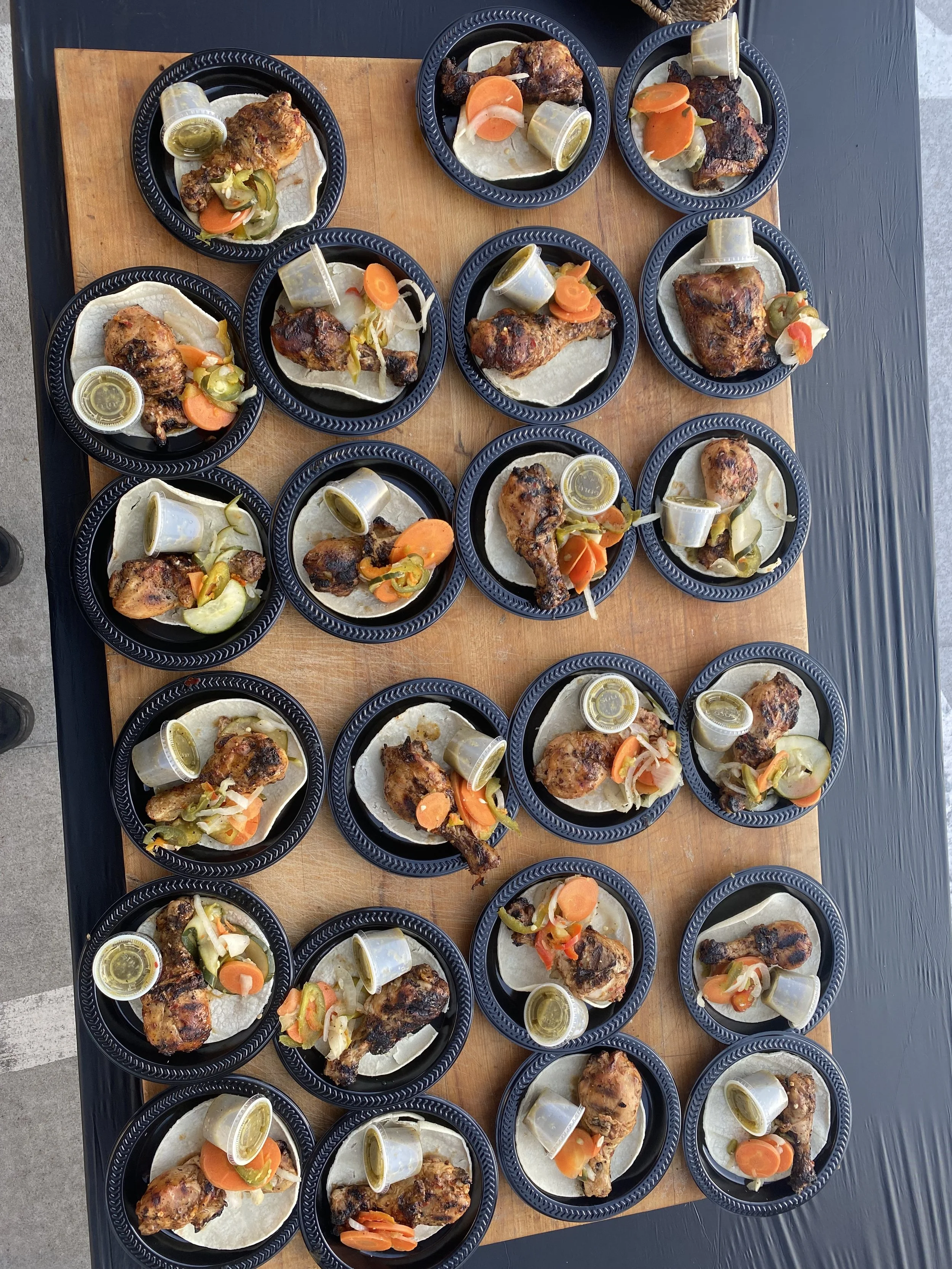 Several black plastic plates with grilled chicken, serving of vegetables, and small containers of sauce on a wooden table.